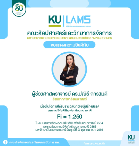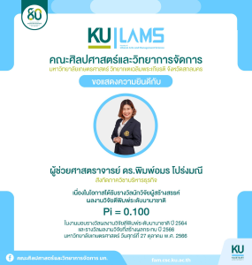 เนื่องในโอกาสได้ รับรางวัลนักวิจัยผู้สร้างสรรค์ ผลงานวิจัยตีพิมพ์ระดับนานาชาติ Pi=0.100 ในงานมอบรางวัลผลงานวิจัยตีพิมพ์ระดับนานาชาติ ปี 2564 และรางวัลผลงานวิจัยที่สร้างผลกระทบ ปี 2566 มหาวิทยาลัยเกษตรศาสตร์ วันศุกร์ที่ 27 ตุลาคม พ.ศ.2566