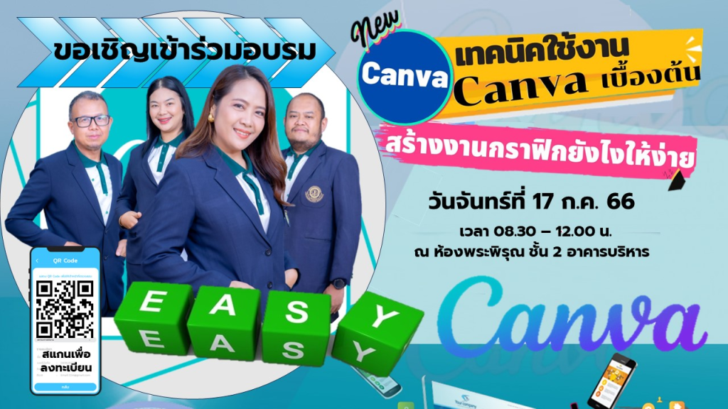 - หัวข้ออบรม“การใช้Canva เบื้องต้น เพื่อสร้างงานกราฟฟิก” 2 ชั่วโมง โดย คุณพชรธรณ์ โอภาส นักประชาสัมพันธ์ชำนาญการ