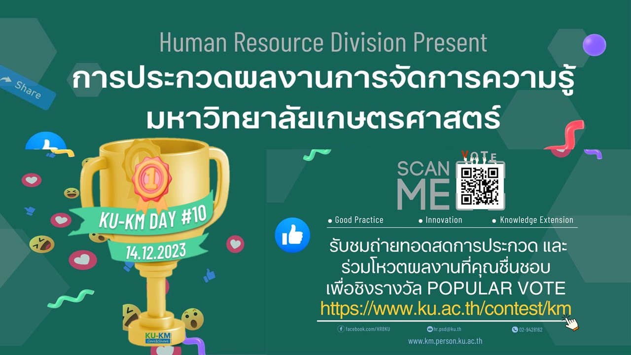 เชิญชวนบุคลากรมหาวิทยาลัยเกษตรศาสตร์ รับชมการถ่ายทอดสดการประกวดรางวัลผลงานการจัดการความรู้ ในโครงการ วันแห่งการแลกเปลี่ยนเรียนรู้ ครั้งที่ 10 (KU-KM Day)