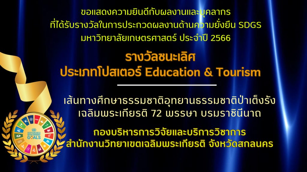 รางวัลในการประกวดผลงานด้านความยั่งยืน SDGs มก. 0 โดย แสวง บุญราศรี เมื่อ 2 มกราคม 2024 ข่าวสารและกิจกรรม, คณะทรัพยากรธรรมชาติและอุตสาหกรรมเกษตร, คณะวิทยาศาสตร์และวิศวกรรมศาสตร์, คณะศิลปศาสตร์และวิทยาการจัดการ, คณะสาธารณสุขศาสตร์, ผลงานและรางวัล, สายวิชาการ, สายสนับสนุนและช่วยวิชาการ, สำนักงานวิทยาเขตเฉลิมพระเกียรติ จังหวัดสกลนคร แชร์ Facebook Twitter Pinterest Email Reddit Telegram มหาวิทยาลัยเกษตรศาสตร์ วิทยาเขตเฉลิมพระเกียรติ จังหวัดสกลนคร ขอแสดงความยินดีอย่างยิ่งกับบุคลากร และผลงานที่ได้รับรางวัลทุกรางวัล จาก รางวัลผลงานด้านความยั่งยืน SDGs จำนวน 6 รางวัล ★ ★°★ . *. °☆ . ● . ★ ☆ ★ ° ☆ ¸. ¸★