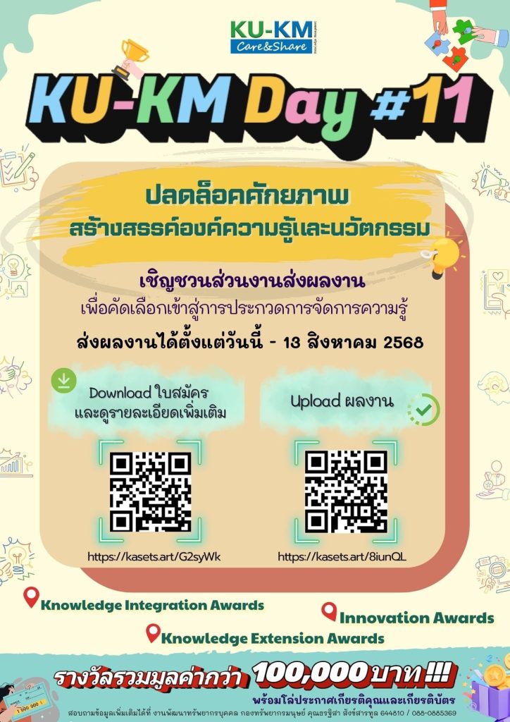 เชิญชวนส่วนงานส่งผลงานเพื่อคัดเลือกเข้าสู่การประกวดการจัดการความรู้ 0 โดย พลอยไพลิน ชัยมาโย เมื่อ 29 กรกฎาคม 2025 ข่าวสารและกิจกรรม แชร์ Facebook Twitter Pinterest Email Reddit Telegram เชิญชวนหน่วยงาน ส่วนงาน ส่งผลงานเข้าร่วมคัดเลือกเพื่อประกวดรางวัลในโครงการ KU-KM Day ครั้งที่ 11 ประเภท Knowledge Integration Awards (กลุ่มองค์ความรู้ตามภารกิจและกลุ่มจากโครงการผู้กล้าท้า AI) ประเภท Knowledge Extension Awards ประเภท Innovation Awards ส่งผลงานได้ตั้งแต่วันนี้ – 13 สิงหาคม 2568 ดาวน์โหลดใบสมัครและรายละเอียดเพิ่มเติมได้ที่ https://kasets.art/G2syWk ติดต่อผู้ประสานงาน ธรฐิสา สังข์สารทูล (อุ้ม) เบอร์โทรศัพท์ภายใน 644810 และ 644830