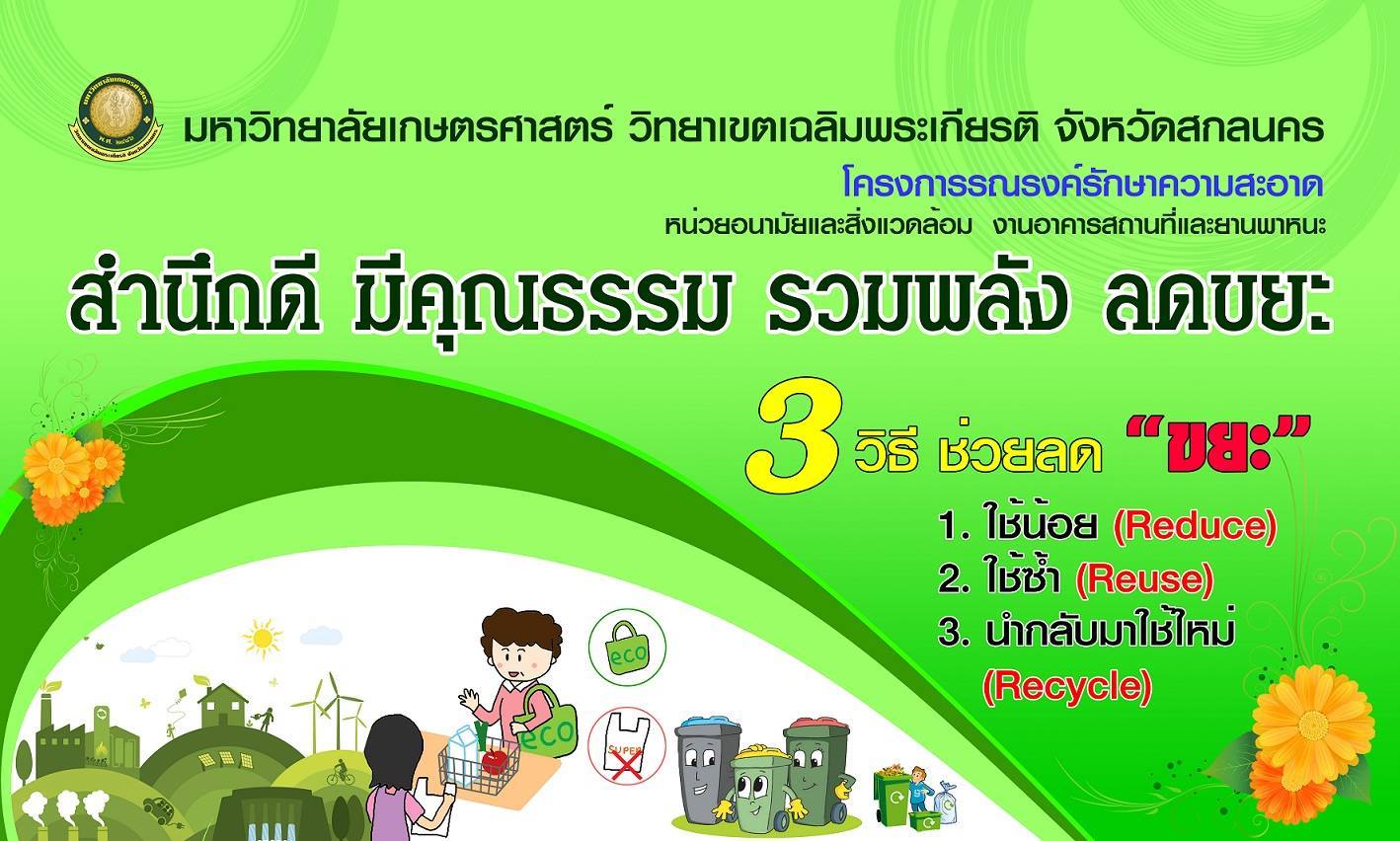 กองบริการกลาง มหาวิทยาลัยเกษตรศาสตร์วิทยาเขตเฉลิมพระเกียรติ จังหวัดสกลนคร ได้จัด โครงการบริหารจัดการขยะ ประจำปี 2566 เพื่อให้เกิดความร่วมมือและจัดการขยะแบบคัดแยกจากต้นกำเนิดและการแยกขยะกลางทาง โดยสร้างกระบวนการเรียนรู้ในมหาวิทยาลัยฯ ในการบริหารจัดการขยะ นอกจากนั้นยังเป็นการส่งเสริมด้านสิ่งแวดล้อม ลดปริมาณขยะที่นำไปกำจัด ช่วยลดสภาวะเรือนกระจก หรือ สภาวะโลกร้อน แก้ไขปัญหาสิ่งแวดล้อมโดยภาคประชาชนอย่างแท้จริง