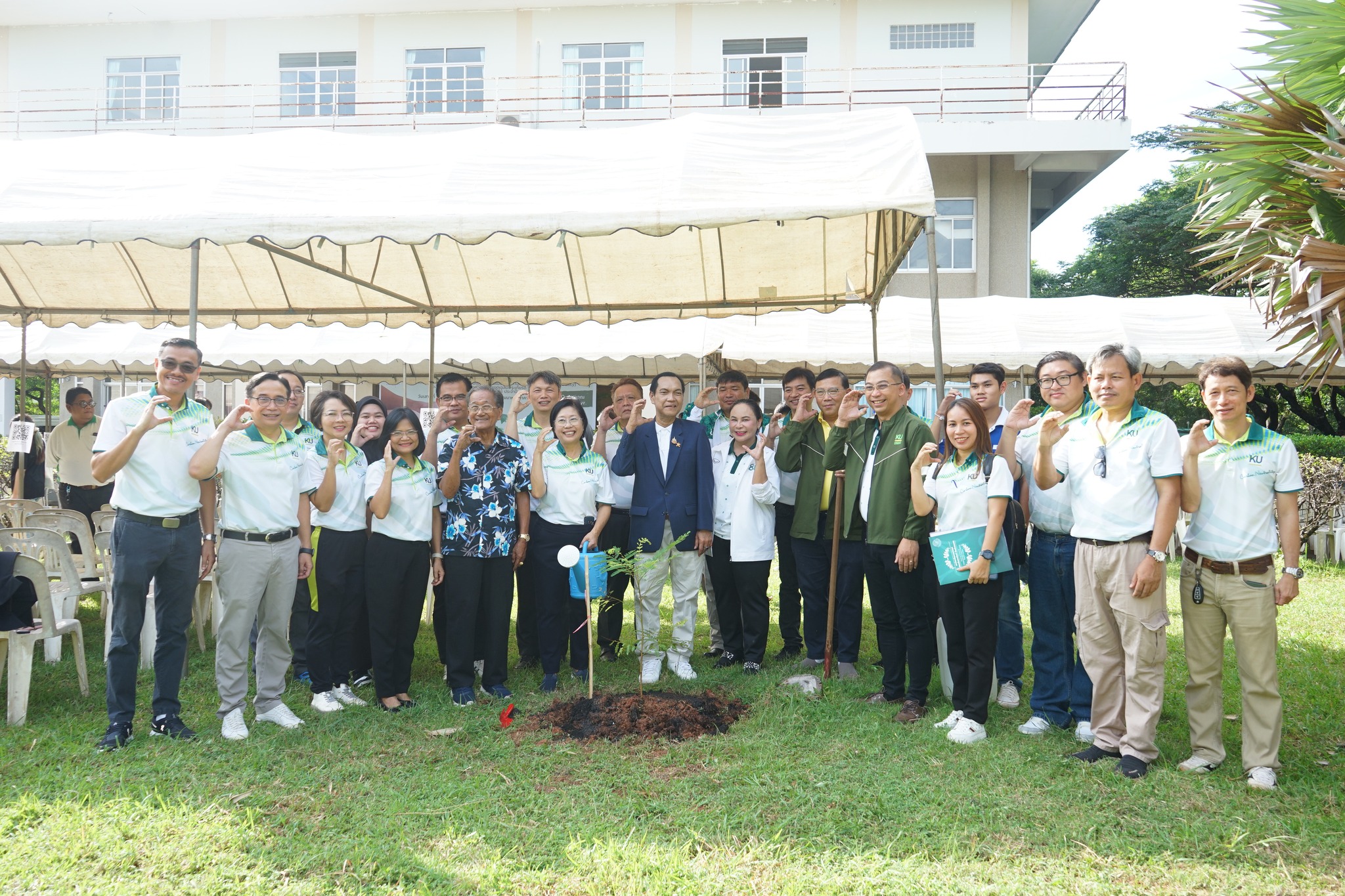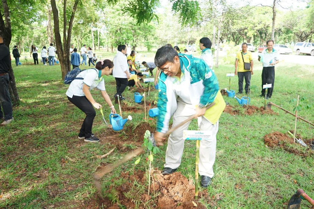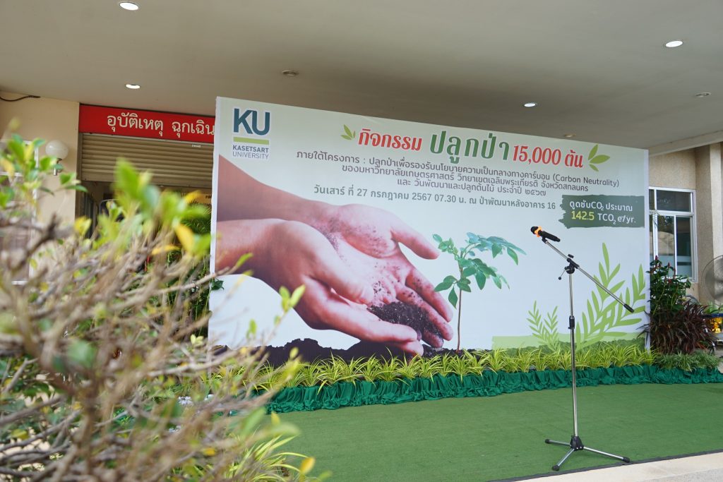 ดร.จงรัก วัชรินทร์รัตน์ อธิการบดีมหาวิทยาลัยเกษตรศาสตร์ นำคณะผู้บริหาร คณาจารย์และนิสิตร่วมปลูกต้นไม้ในโครงการ ในวันที่ 27 กรกฎาคม 2567 โดย ผู้ช่วยศาสตราจารย์ ดร.วัชรพงษ์ อินทรวงศ์ รองอธิการบดี มหาวิทยาลัยเกษตรศาสตร์ วิทยาเขตเฉลิมพระเกียรติ จังหวัดสกลนคร ได้จัดกิจกรรม โครงการปลูกป่าเพื่อรองรับนโยบายความเป็นกลางคาร์บอน (Carbon Neutrality) ของมหาวิทยาลัยเกษตรศาสตร์ และโครงการวันพัฒนาและปลูกต้นไม้ประจำปี 2567 ณ ป่าพัฒนาอาคาร 16 (อาคารสถานพยาบาล) ได้กล่าวรายงานวัตถุประสงค์ ดังนี้ (1) เพื่อปลูกตันไม้ เพิ่มพื้นที่สีเขียวภายในวิทยาเขตเฉลิมพระเกียรติ จังหวัดสกลนคร (2) เพื่อเป็นการดูแลบำรุง รักษา ใส่ปุ๋ยต้นไม้ที่ปลูกแล้วให้มีการเจริญเติบโต (3) เพื่อเป็นการสร้างจิตสำนึกในการรักษาสิ่งแวดล้อมให้เกิดความยั่งยืน (๔) เพื่อวายพื้นราชสักกกกระ สนองแนวทางตามพระราชปณิธาน ในการอนุรักษ์พื้นฟูระบบนิเวศทางสิ่งแวดล้อม โดยมีนิสิต บุคลากร เข้าร่วมกิจกรรม 1,000 คน และมีเป้าหมายในการปลูกต้นไม้ให้ได้จำนวน 15,000 ต้น